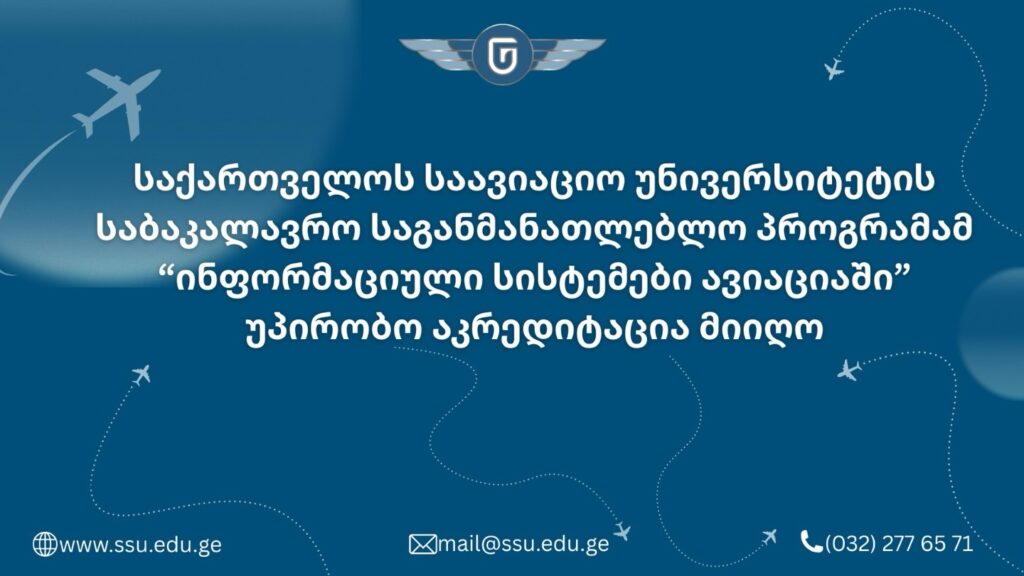 საქართველოს საავიაციო უნივერსიტეტის საბაკალავრო საგანმანათლებლო პროგრამამ -“ინფორმაციული სისტემები ავიაციაში”უპირობო აკრედიტაცია მიიღო.